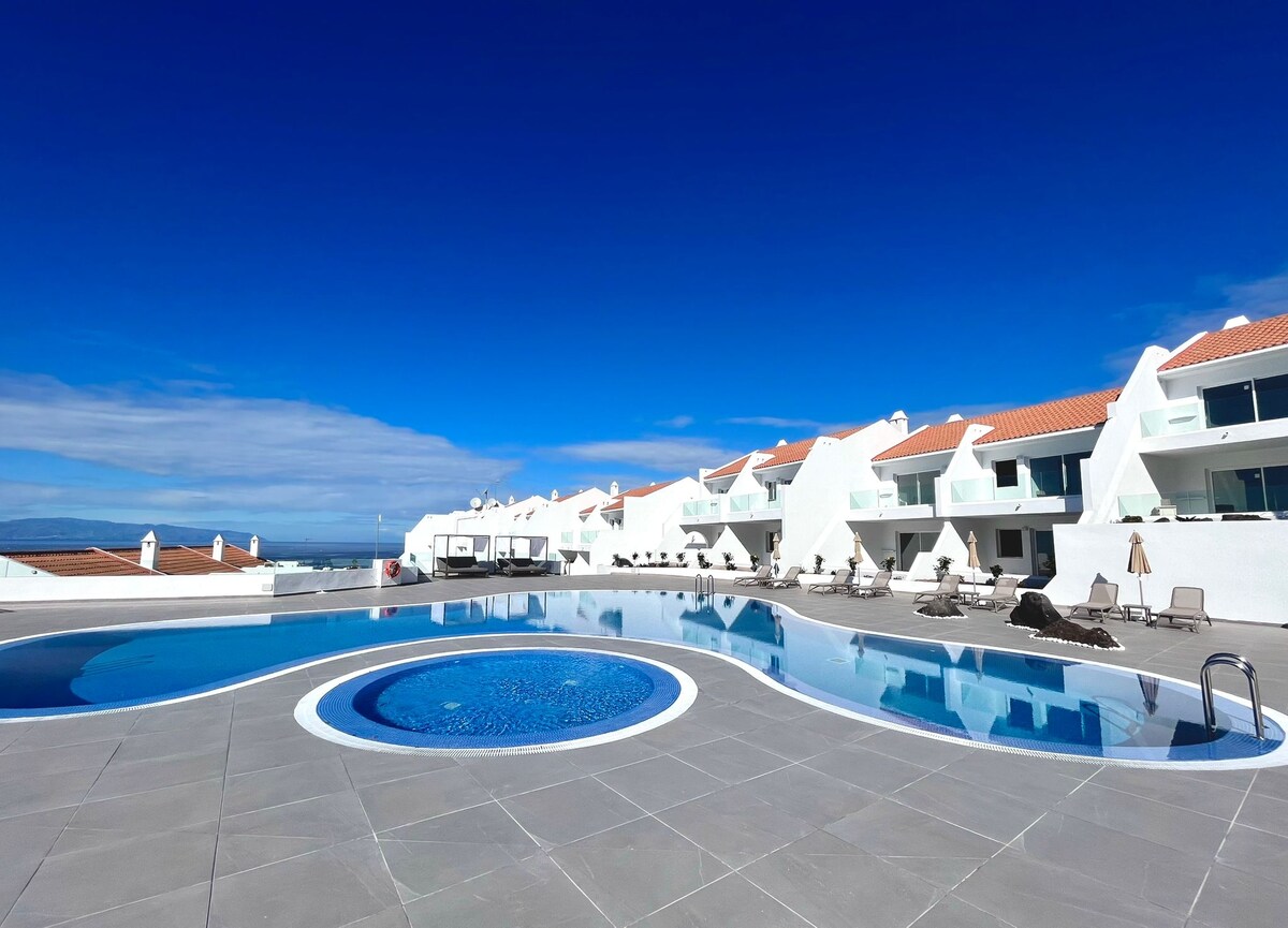Neue moderne Wohnung an der Costa Adeje mit schöner Aussicht. Ausgestattet vom Schlaf- und Wohnzimmer, die mit der Küche verbunden sind Im Aparthotel mit beheizten Pools, Longers und Rezeption gelegen