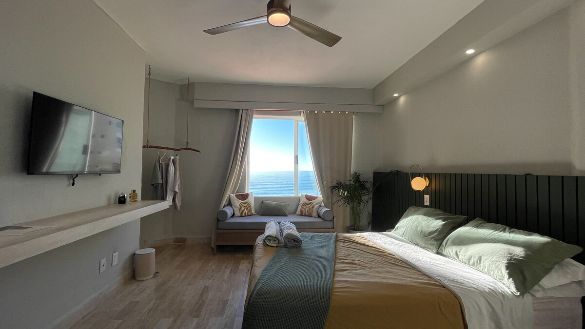 Studio mit Kingsize-Bett und spektakulärer Aussicht. Direkter Zugang zu Privatstrand. Wir teilen uns die Einrichtungen mit einem Boutique-Hotel, sodass du freien Zugang zu den Annehmlichkeiten wie Pools, Strand, Stühlen, Cabanas, Whirlpool, Fitnessraum und Tennisplatz hast. Optionales tägliches All-Inclusive-Armband durch das Hotel – Kauf an der Rezeption – (heute 95 USD p.P. pro Tag). Du darfst auch deine eigenen Getränke oder Speisen mit in den Poolbereich nehmen (kein Glas). Café in der Lobby, schöne Restaurants und ein Lebensmittelgeschäft befinden sich auf der anderen Straßenseite.
