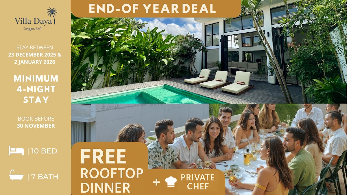 Diese Mega-Luxus-Villa befindet sich im Herzen von Berawa, Canggu. Die Villa Yoop verfügt über Personal, das rund um die Uhr zum Reinigen, Kochen und für die Sicherheit zur Verfügung steht. Wir bieten Platz für 12 Gäste, können aber auf maximal 14 Personen erweitert werden. Die Villa liegt nur wenige Gehminuten vom Strand entfernt. Gut geeignet für alle Surf-, Kitesurf-, Bodyboard-Levels und hat die besten Sonnenuntergänge auf Bali. Die Gegend von Berawa ist bekannt für die gemütlichen Restaurants, Bars, Strandclubs, das tolle Nachtleben, Spa-Salons und Yogastudios. All das zu Fuß erreichbar!