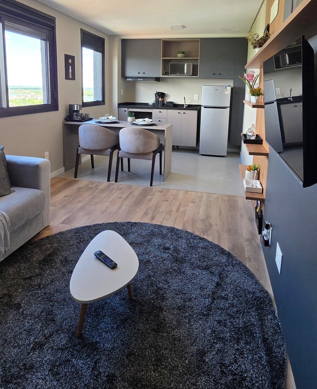 Studio com garagem na melhor localização de Pelotas. Hospede-se no Edifício Canto, com uma vista deslumbrante para cidade e desfrute de uma estadia confortável em um loft sofisticado. Comodidades: - Cama Queen - Enxoval de ótima qualidade com lençóis de 2500 fios - Cafeteira Nespresso - Jogo de Toalhas - Secador de cabelo - Amenities de banho - Espelho de corpo inteiro - SmartTV 43" com rotação 360° - Wifi - Ar Condicionado Samsung WindFree Quente e Frio - Cozinha completa - Portaria 24h