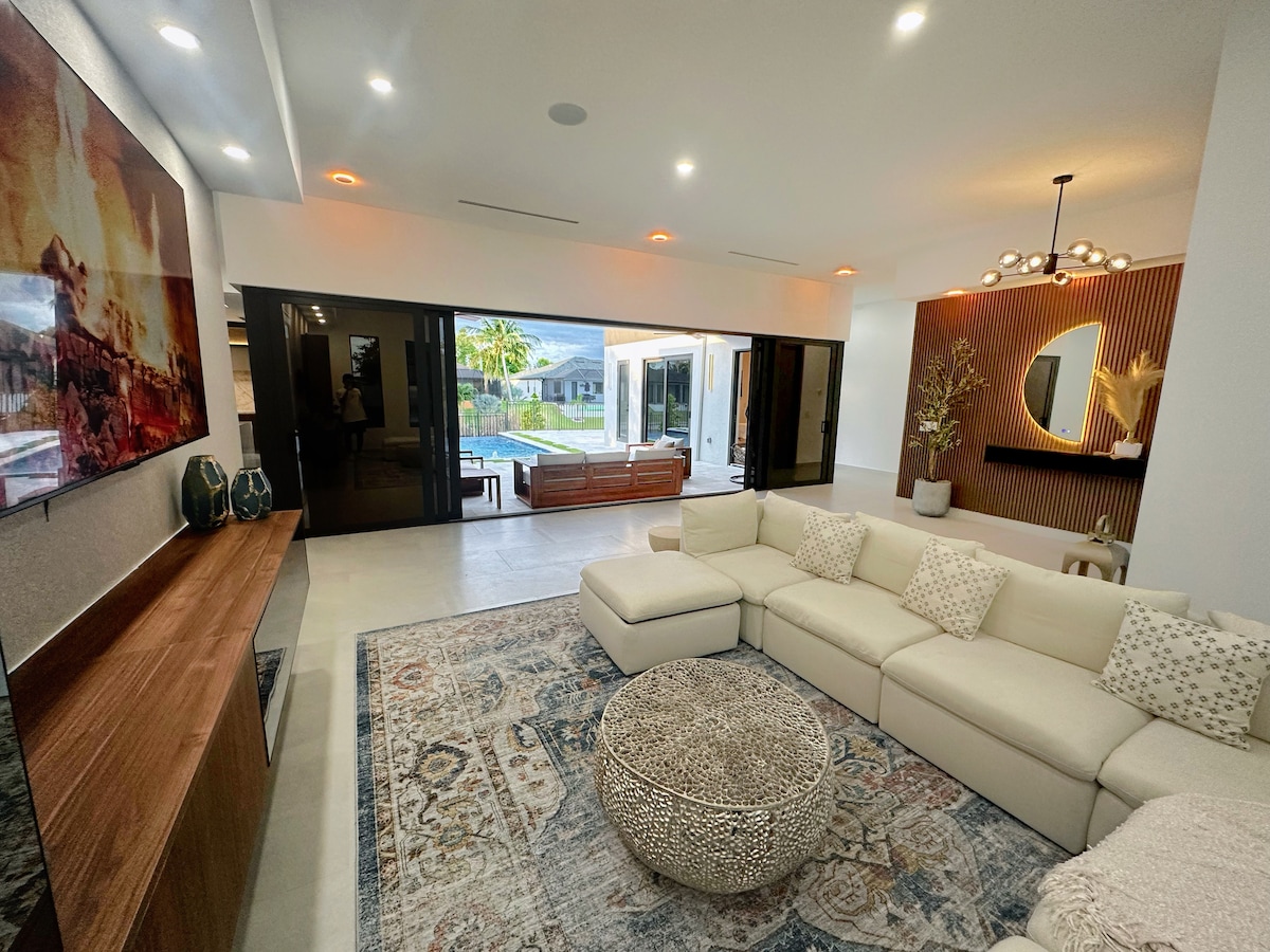 Komplett renoviert und neu eingerichtet! Erleben Sie die schönsten Wochen in der brandneu durch ein professionelles Designerteam komplett renovierten Villa Sunset Serenade II. Das mit einem tollen Lichtkonzept ausgestattete offene Wohnzimmer mit der nagelneuen großen modernen Küche der Ess- und Kochinsel sowie mit Kamin und Großfernseher. Die große italienische Ledercouch mit den großen elektrischen Sessel erlaubt einen tollen Blick auf den breiten Kanal und laden zum genießen ein.