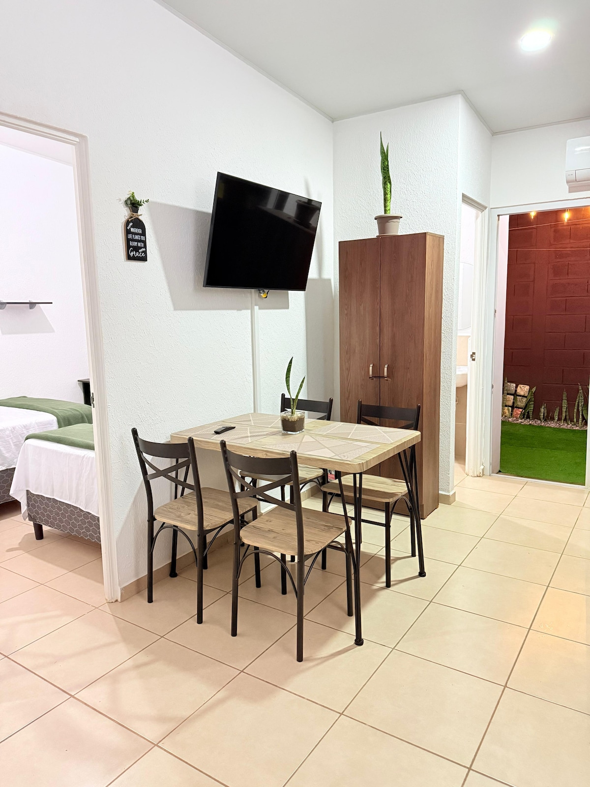 Moderne Wohnung, Zugang zum Mini-Fitnessstudio und Arbeitsbereich, in einer sicheren Wohngegend, 45 Minuten vom Flughafen, 15 Minuten von den wichtigsten Einkaufszentren entfernt. In der Umgebung gibt es einfachen Zugang zu Supermärkten, Apotheken, dem Cuscatlán-Stadion, Busverbindungen, Restaurants usw. Sie befindet sich auf der fünften Ebene und verfügt über Klimaanlage, Smart-TV – 55 Zoll, WLAN 50 mg, Küche, privates Badezimmer, kleinen Schreibtischbereich, Waschbereich. 1 privater Parkplatz und ferngesteuerter Eingang.