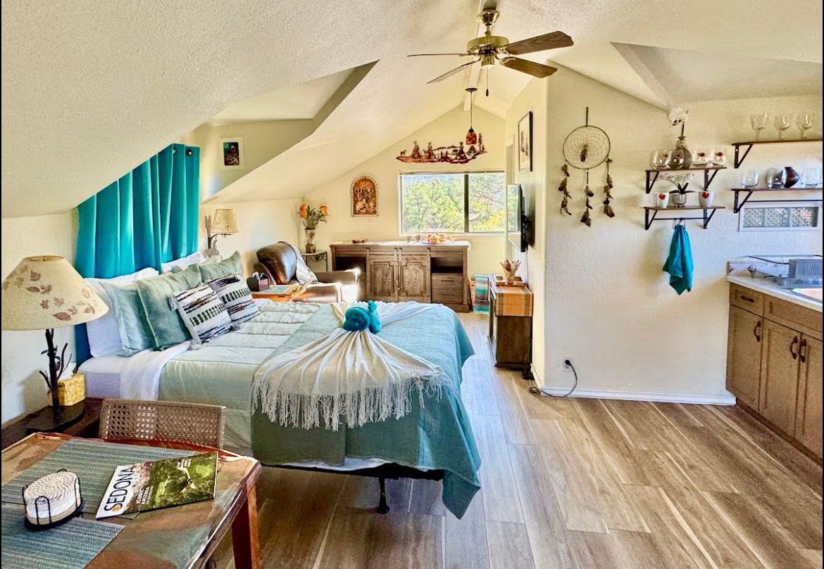 Dieses stilvolle Studio ist der perfekte Ort, um dem Stadtleben zu entfliehen und die Ruhe und den Frieden von Sedonas Hochgebirgswüste zu erleben. Ideal gelegen am Rande der Stadt auf mehr als 5 Hektar, hast du Platz zum Wandern. Genieße Sonnenaufgänge und Sonnenuntergänge. Verbringe Zeit unter dem Sternenhimmel und nimm die ganze Weite der Milchstraße in dich auf. Im Inneren findest du alle Annehmlichkeiten – luxuriöse Hotelbetten, einen riesigen Flachbildfernseher, eine gut ausgestattete Küchenzeile (Kaffee inklusive!), eine Waschmaschine/einen Trockner und ein großes Badezimmer.