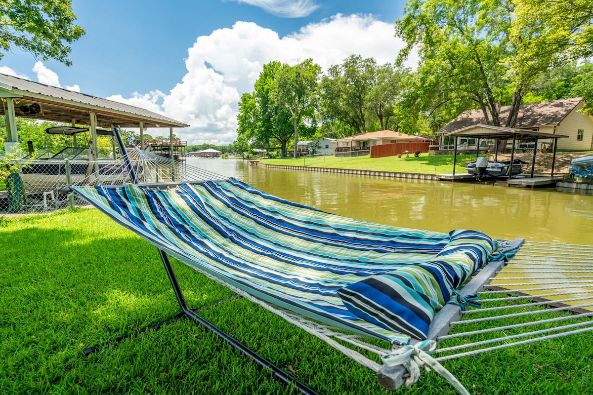 This contemporary, Banksy-inspired boathouse is just an hour from Dallas and sleeps 10. Hot Tub & kayaks included! Enjoy direct water access with a private boat lift and nearby neighborhood ramp. Nestled in a quiet area, this waterfront property features a deck with open cove views, 3 bedrooms (including a bunk room), 2 full bathrooms, an outdoor patio, grill, a coffee bar, and a fully stocked kitchen. Full day access on check-in or check-out days is available as an option, pending availability.