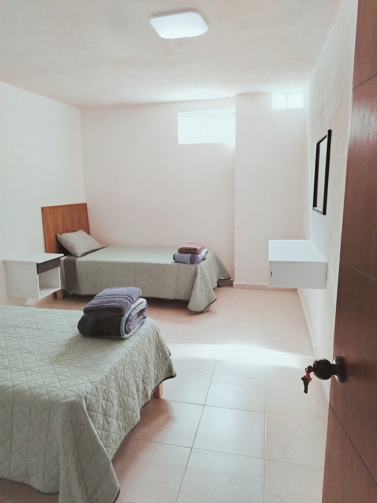 Neue und moderne Wohnung in einer privaten Unterabteilung mit Zugangskontrolle und 24-Stunden-Überwachung. Sie befindet sich in einer ruhigen Gegend mit schnellem Zugang zu den Hauptstraßen der Stadt. Es gibt einen offenen Parkplatz vor der Wohnung. Sie verfügt über zwei Schlafzimmer, Schränke, ein Badezimmer und einen Waschbereich. Um die Wohnung zu betreten, musst du einige Treppen hinaufsteigen. Es ist der ideale Ort, wenn du Celaya besuchst, für Arbeit, Urlaub oder für eine Veranstaltung. Wir freuen uns auf deinen Besuch