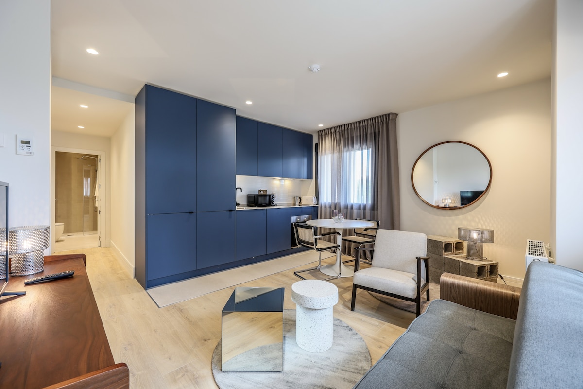 Das Doppelzimmer verfügt über 30 m ², in denen du eine Küchenlounge findest, und ein separates Zimmer mit einem Bett von 150 cm. Privates Badezimmer mit Dusche und einer Küche mit Backofen, Cerankochfeld, Dunstabzugshaube, Mikrowelle, Waschbecken, Kühlschrank mit Gefrierfach und Küchenutensilien. Das Zimmer verfügt außerdem über einen Kleiderschrank, einen großen Esstisch, Smart-TV und Klimaanlage. Die Zimmer sind mit einem Aufzug zugänglich.
