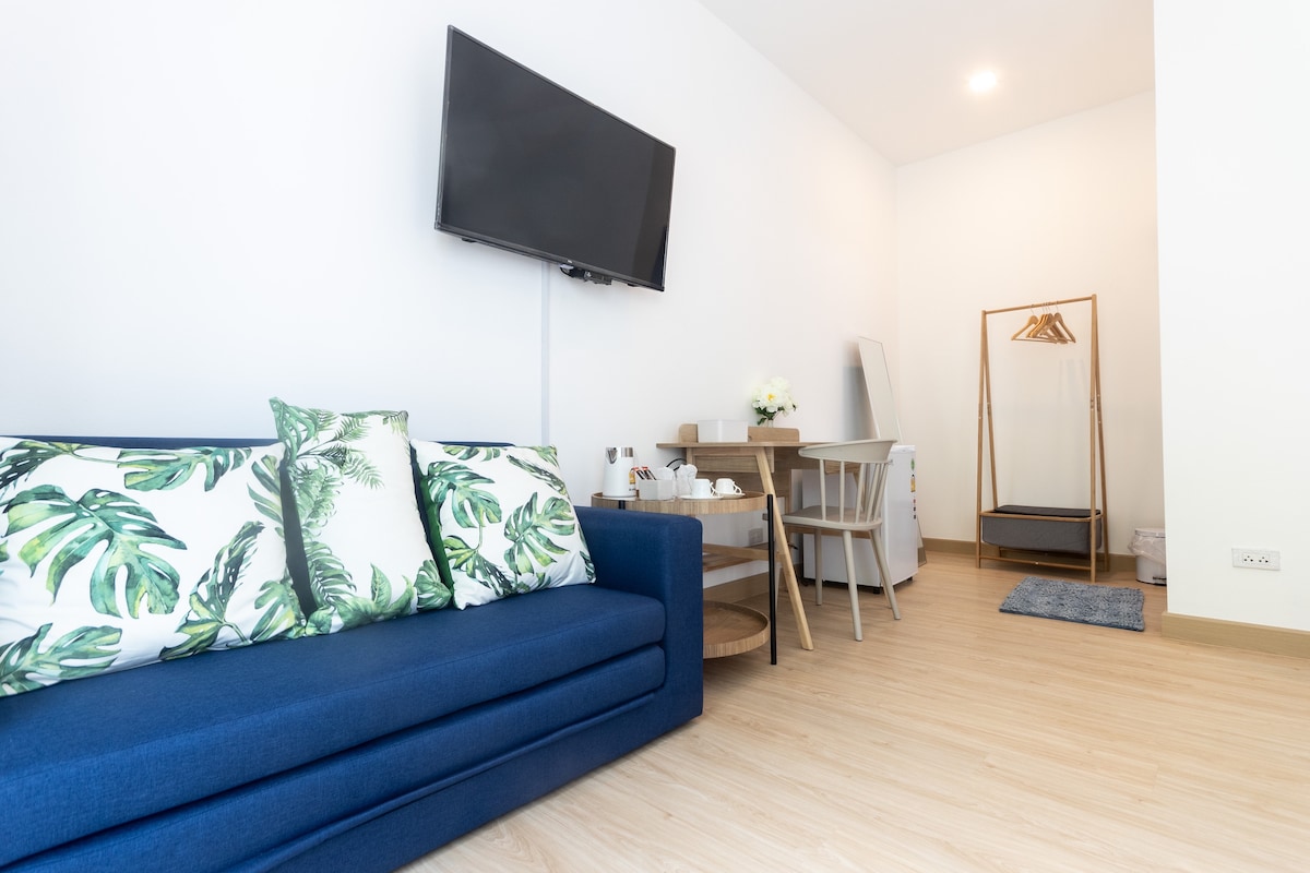 Entworfen, um den Bedürfnissen moderner Reisender gerecht zu werden. Saubere, übersichtliche Zimmer mit frischer, weißer Bettwäsche, eigenem Bad, Klimaanlage, TV und tollem WLAN. Entspanne dich draußen an unserem Swimmingpool oder genieße einen Snack in unserem Café und Restaurant, wo kostenloses Frühstück serviert wird. Du hast auch einen Gästebereich mit Kühlschrank, Mikrowelle und Wasserkocher. Lehn dich zurück und genieße deine Umgebung. Wir haben auch andere Zimmer! Santi (3 Personen) Sabai (3) und eine Familiensuite – 3 Schlafzimmer (8) Suche nach unseren Inseraten oder sende uns eine Nachricht.