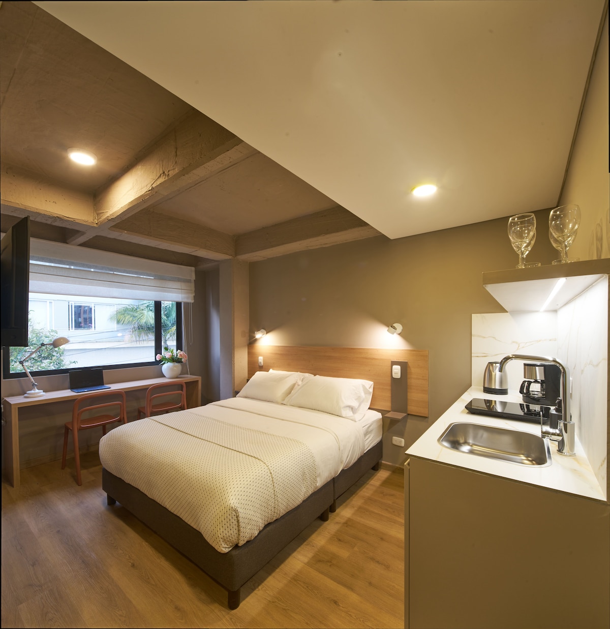 Genieße ein sauberes, gemütliches Loft mit allem Komfort, den du brauchst. Sie verfügt über schnelles WLAN, eine voll ausgestattete Küche und einen eigenen Balkon, um frische Luft zu schnappen. Dir steht auch eine Dachterrasse mit 360°-Blick auf Bogotá zur Verfügung, die sich perfekt zum Arbeiten oder Entspannen eignet. Das Gebäude bietet Coworking-Spaces, Wäscherei und einen 24/7-Rezeptionsservice. In einer sicheren Gegend gelegen, mit digitalem Check-in und Zugang zu jeder Zeit. Restaurants, Cafés und öffentliche Verkehrsmittel sind nur wenige Schritte entfernt.