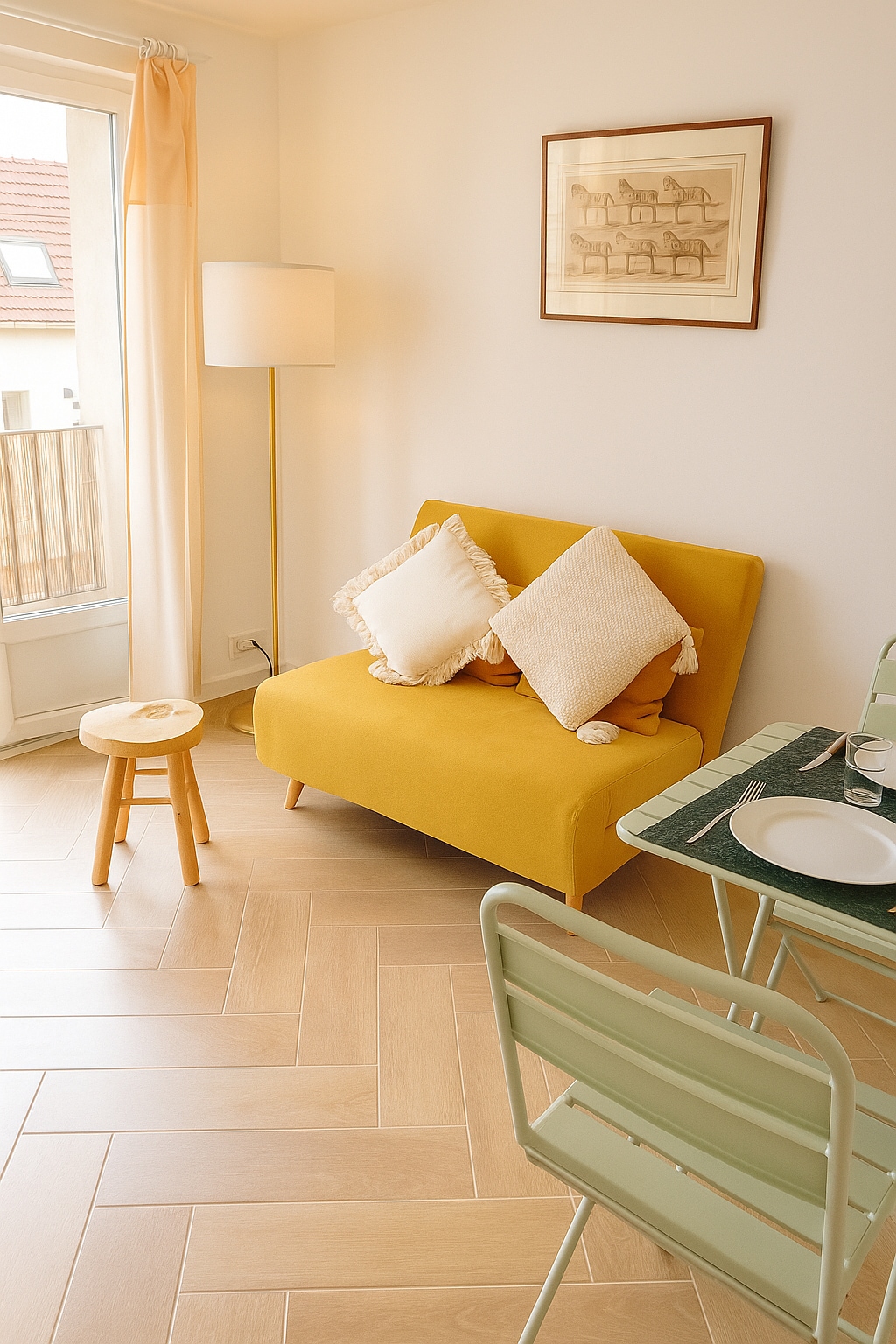 Studio rénové pour 2 personnes au 1er étage, avec terrasse, Wi-Fi rapide et décoration soignée. Excellente literie, Smart TV, cuisine équipée et arrivée autonome avec boîte à clés. À votre arrivée, une collation et un panier petit-déjeuner sont offerts. Lit bébé sur demande. Local à vélos sécurisé. Parking public gratuit à 100 m (200 places). Excellent rapport qualité/prix pour séjours pros ou touristiques.