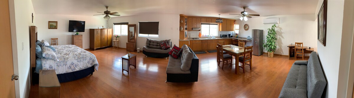 Bienvenido a tu LOFT urbano estilo cabaña! Estamos ubicados en una zona familiar y segura con una excelente ubicación. Envuelvete en nuestros modernos espacios con ese toque rústico y disfruta del clima con una agradable terraza con vista al jardín. El LOFT cuenta con cochera techada, entrada independiente y cámaras de circuito cerrado al exterior. Te encuentras a solo 12 minutos del centro histórico, y a 5 minutos de la zona más moderna de la ciudad Distrito 1.