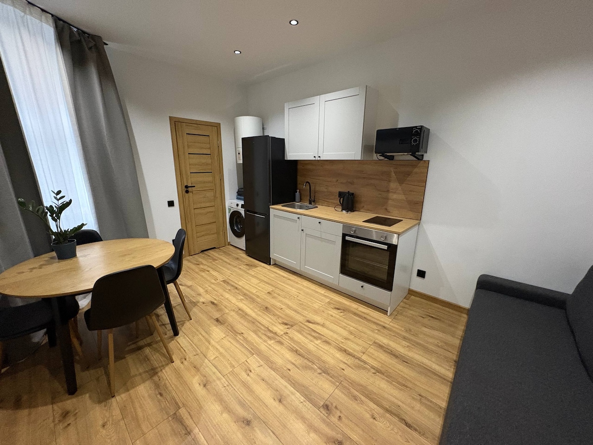 Ausgezeichnete Lage, 450 Meter von der Spodek Arena, dem Internationalen Kongresszentrum, der Kulturzone von Katowice entfernt. Selbst-Check-in, Rezeption Mo-Fr 7:00 - 19:00 Uhr, Sicherheit und kostenloser, überwachter Parkplatz. Klimatisiertes, sicheres, voll ausgestattetes, ruhiges Studio. In der Nähe befinden sich ein Żabka-Lebensmittelgeschäft, Geschäfte, eine Apotheke, eine Pizzeria und andere... Die wichtigste öffentliche Verkehrsader befindet sich gleich um die Ecke. Eine 5-minütige Fahrt zum Einkaufszentrum Silesia (1,2 km), Legendia, Silesian Park und dem Zoo (2,2 km).