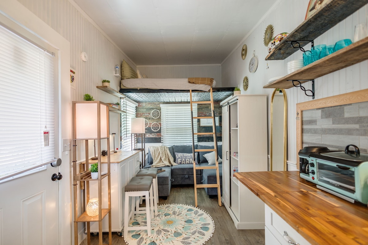 Das Tiny House auf „The Farm“ überdachte Veranda + Grill