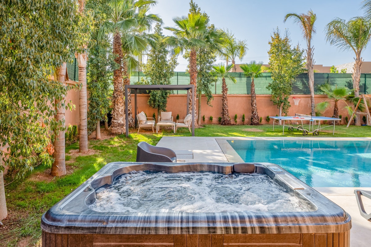 Wachen Sie vor dem Atlasgebirge in einer Luxusvilla auf, die Raum, Komfort und Privatsphäre vereint. Auf 3.500 m² Grundstück gelegen, bietet es 5 raffinierte Suiten mit eigenem Bad, helle Lounges und eine Kapazität von 14 Personen (30 mit der angrenzenden Schwester-Villa). Genießen Sie einen Pool, Glasfaser-Internet, Netflix/IPTV, eine Garage mit 8 Plätzen sowie Dienstleistungen auf Anfrage: Koch, Reinigung, gelieferte Mahlzeiten und organisierte Transfers für einen unbeschwerten Aufenthalt in Marrakesch.