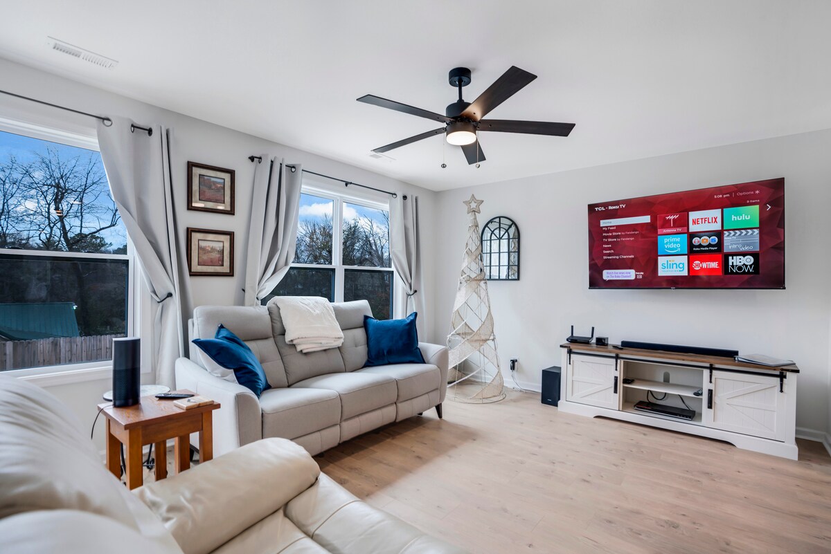 Kick back and relax in this calm, stylish space. With 2 living rooms & an outdoor living area, there will be plenty of space for you to spread out and get comfy. New 65" Smart TV & long comfy couch - perfect for movie nights with the whole group! Local Attractions- 5 miles from Downtown Clarksville (~10min) 15 miles from Fort Campbell (~30min) 45 miles from Downtown Nashville (~45min)