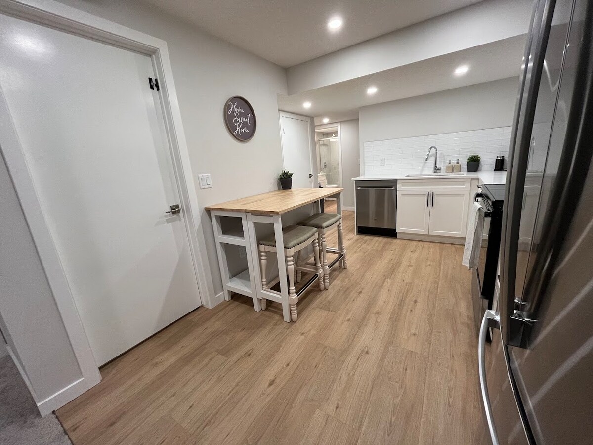 Entspanne dich mit der ganzen Familie in dieser ruhigen, neu gebauten Unterkunft! Wir sind nur 30 Minuten von der Innenstadt von Calgary und 1 Stunde von Banff entfernt, mit der Möglichkeit zum Wandern, Skifahren und Erkunden der Natur in Kananaskis, Bragg Creek und Canmore. Genieße unsere Kellerwohnung mit eigenem Eingang. Diese Unterkunft ist Teil unseres Familienhauses, in dem wir mit unserem Hund Max und unserer Katze Menue leben. Obwohl dies ein ruhiger Haushalt ist, können Gäste normale Haushaltsgeräusche hören — einschließlich Max, der von Zeit zu Zeit bellt.