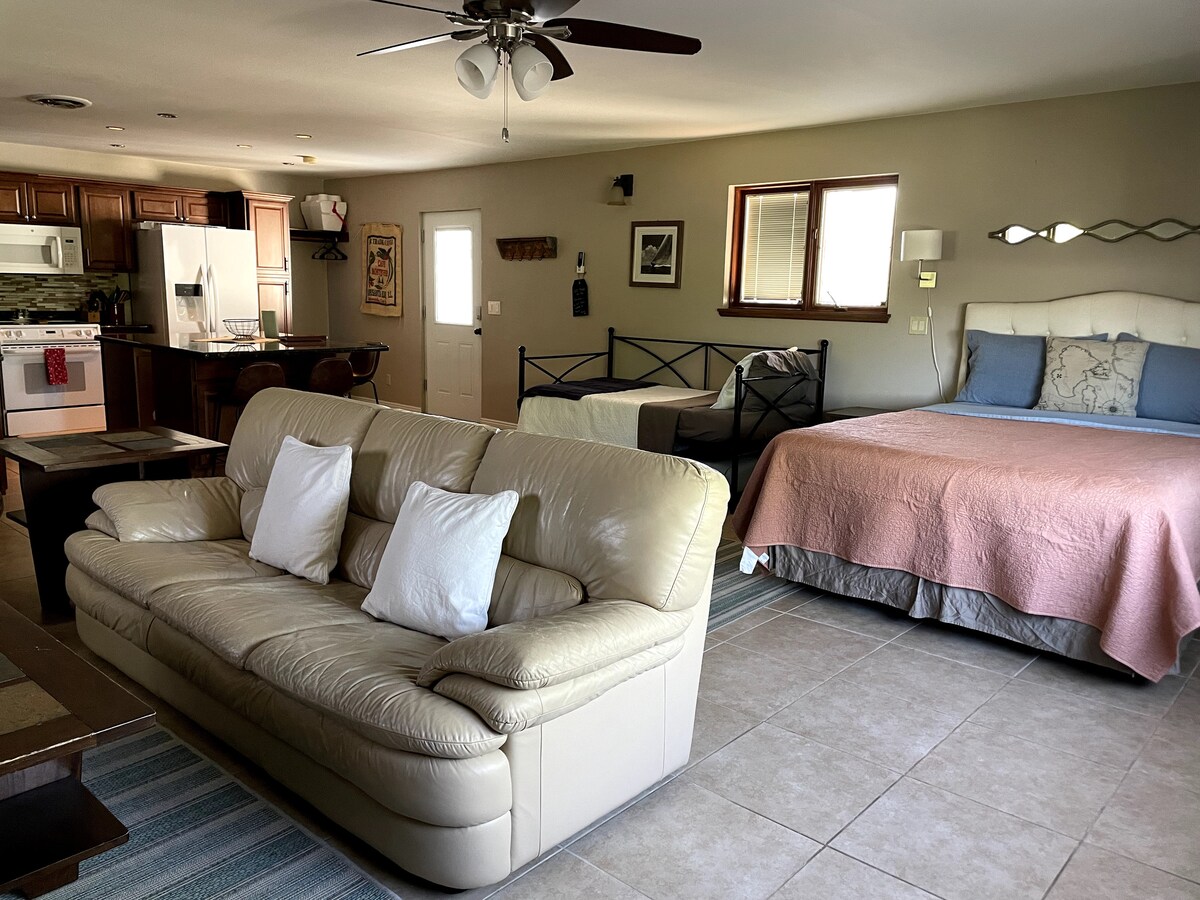 Unser Zuhause liegt in einer fantastischen Umgebung mit schöner Aussicht, einfachem Zugang zum Rim Trail und einem kurzen Spaziergang zu Restaurants. Genieße den privaten Zugang zu einem geräumigen Studio-Apartment über der Garage – dein eigener Rückzugsort. Es verfügt über ein Queensize-Bett, ein Ausziehbett mit zwei Einzelbetten, ein Badezimmer mit Dusche, einen Wohnbereich und einen Balkon, um die Landschaft zu genießen. Die Küche mit großer Insel eignet sich hervorragend zum Essen, Spielen oder sogar zum Arbeiten. Ein wunderbarer Ort zum Entspannen, nachdem du die Gegend erkundet hast!