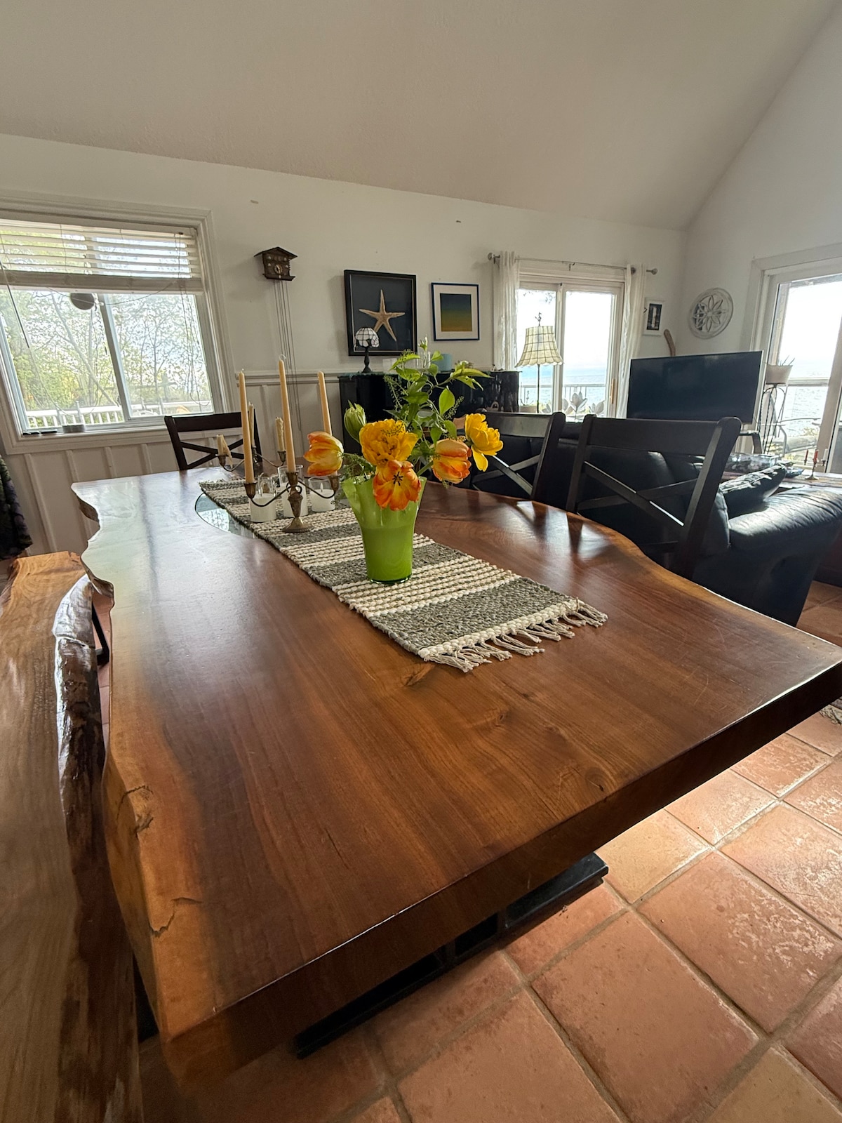 Entspanne dich mit der Familie am See und inmitten der Zedern in diesem ruhigen A-Rahmen-Refugium an der Küste des Lake Huron. Die Tür öffnet sich zu einem großen Wohnzimmer und einer Küche mit einem 180-Grad-Blick auf den See. Eine 8 Fuß lange Insel, die von Barhockern umgeben ist, verankert die Küche. Beobachte die berühmten Sonnenuntergänge am Lake Huron, während du eine Mahlzeit zu dir nimmst oder im Whirlpool entspannst. Unsere Vorderseite ist ein felsiger Strand mit einer Feuerstelle. Wir schwimmen hier mit unseren Wasserschuhen. Der Sandstrand liegt 2 Fahrminuten oder 5–10 Minuten mit dem Fahrrad entfernt.