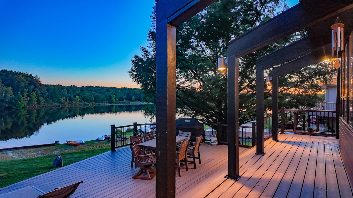 Genieße eine... ✩ Seeblick und Strandlage ✩ Gegenüber von: Spielplatz, Volleyball, Basketball ✩ Eigene Feuerstelle & Brennholz ✩ Bettwäsche & Handtücher ✩ Grill und Propan ✩ Voll ausgestattete Küche ✩ Duschgel, Shampoo, Haarspülung ✩ 2 Kinderbetten, Hochstuhl, Packnplay, Baby Bjorn, Babywanne ✩ Billardtisch, Tischfußballtisch und andere Spiele In der✩ Nähe von Einkaufsmöglichkeiten, Casino, Pocono Raceway ✩ Angelplatz 2 Gehminuten entfernt ✩ Gemütlichkeit mit bis zu zwei Gaskaminen – erste und untere Ebene ✩ Minuten nach Jack Frost & Big Boulder (Schlauchbootfahren im Schnee & Skifahren)