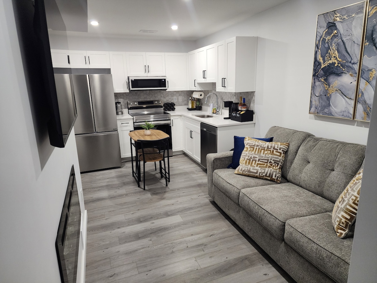 Lehne dich zurück und entspanne dich in diesem ruhigen und stilvollen Haus mit 2 Schlafzimmern, das entworfen wurde, um dich wie zu Hause zu fühlen, obwohl du weit weg von zu Hause bist. 1042 Quadratfuß Platz im Erdgeschoss; du findest 2 Hauptschlafzimmer (für maximal 4 Erwachsene), ein luxuriöses 5-stöckiges Badezimmer, eine Waschküche, eine voll ausgestattete Küche, eine Kaffeebar, ein Esszimmer, ein Wohnzimmer mit einem elektrischen Kamin und ausreichend Parkplätze abseits der Straße. Ob du geschäftlich oder privat verreist, wir möchten dir den komfortabelsten Aufenthalt und das Airbnb-Erlebnis bieten.