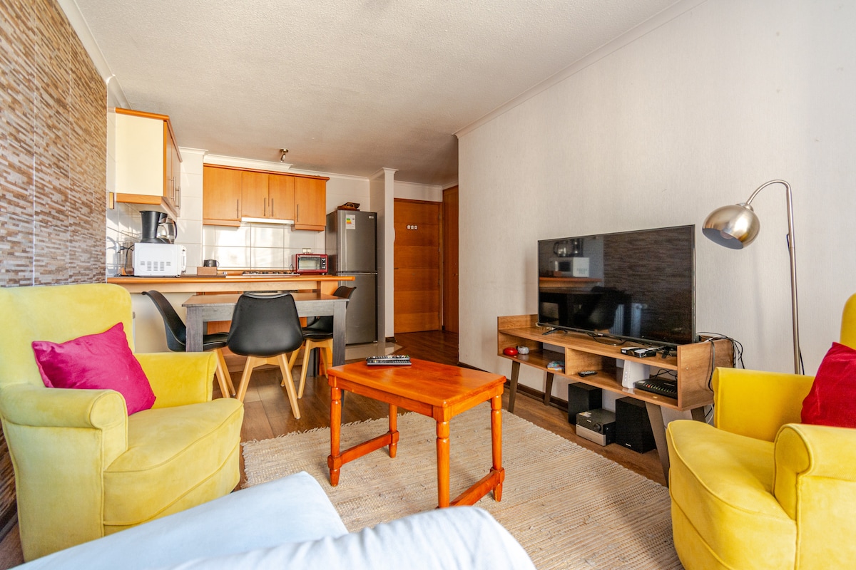 Komplett neue Wohnung in San Pedro de la Paz. Es verfügt über einen 50-Zoll-Fernseher mit Filmplattformen Parkplatz innerhalb der Wohnanlage und direkter Blick vom Balkon. Inklusive Haartrockner, Bügelbrett und Bügeleisen, kostenlose Tee- und Kaffeestation, Handtücher (nur 1 wird gelassen, wenn sie 1 Nacht mieten) Grundlagen zum Kochen. Rauchen ist in der Wohnung verboten (Raucherterrasse vorhanden), Partys sind verboten🚫. Heizung verfügbar Toyotomi mit Paraffin