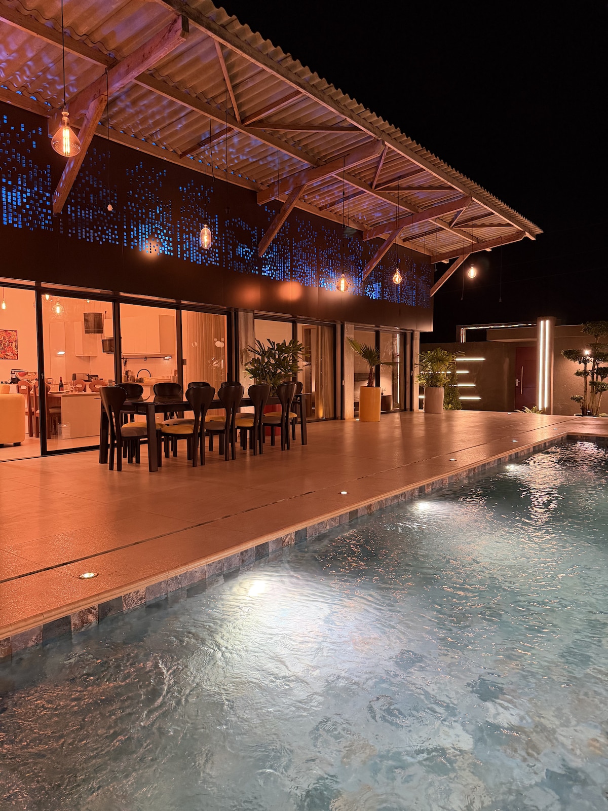 Komm nach Hause, entspann dich und genieße ein neues, modernes Haus mit großen Fenstern und Terrassen, einem privaten Pool, einem Garten, einem Petanque-Bereich, einer Terrasse und einem Parkplatz vor Ort. Die moderne Architektur des Gebäudes zeichnet sich als einzigartig aus. Das Interieur sorgt dafür, dass du dich wie zuhause fühlst, mit einer Kombination aus modernen und traditionellen lokalen Möbeln. Das Frühstück ist inbegriffen. Getränke, Mittag- oder Abendessen können auf Anfrage ebenfalls bereitgestellt werden. Kostenloses WLAN und Satelliten-TV. Die Terrasse mit Bar bietet einen exklusiven Blick auf den Lagunenwald.