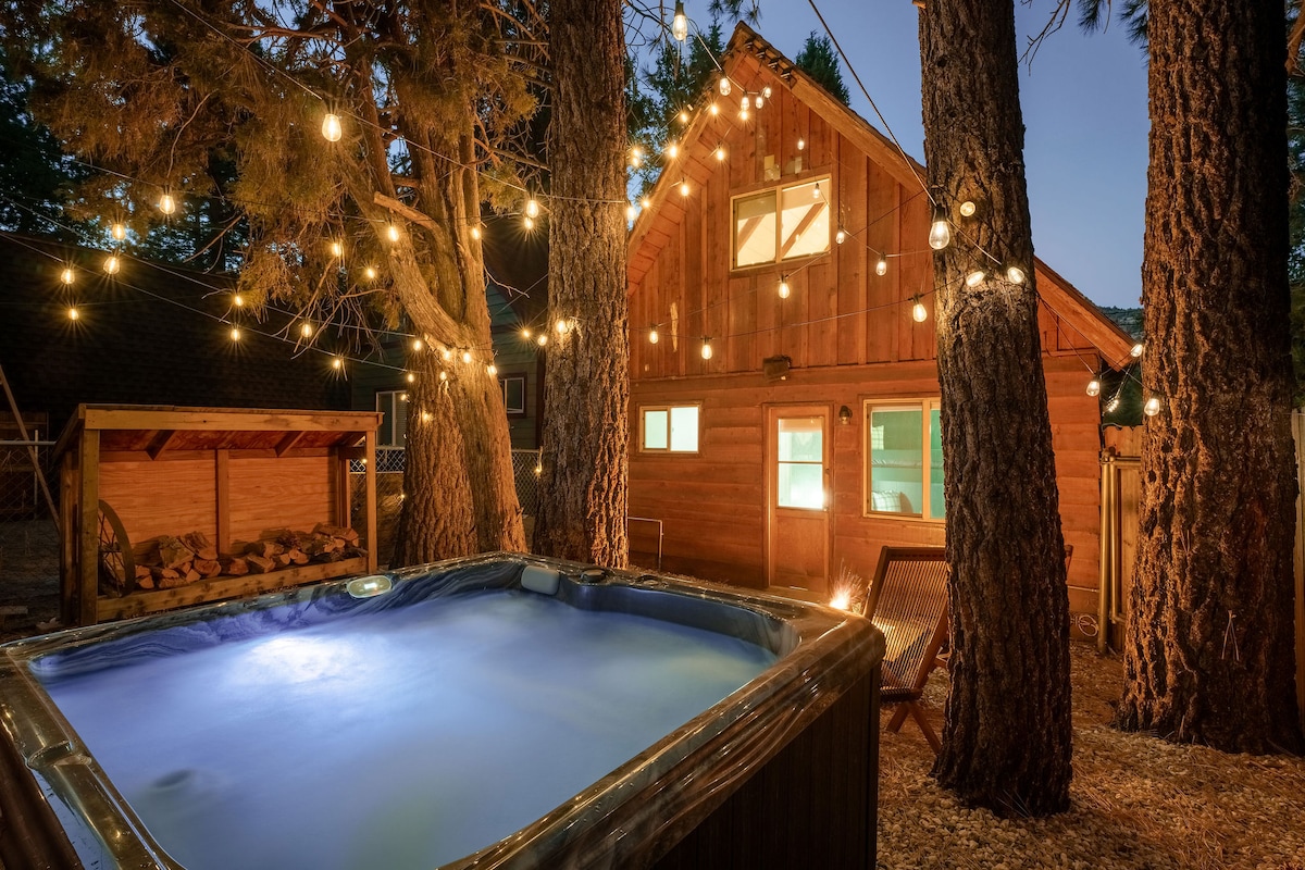 ~ Rustic 750 Sq. Ft cabin. Dog Friendly, fully fenced, beautiful lighting throughout. 8 min to Lake Arrowhead & Lake Gregory ~ Attending a Wedding at the Pine Rose? We are next door! ~ Walking distance to a small market and the best restaurant on the mountain (The Antler Grill) ~ Romantic wood burning fireplace. Central heat & A/C, 65" TV, cable & internet ~ Backyard gas BBQ , 3 person Jacuzzi (2 seat, 1 lounge) hammock, horseshoes & outdoor shower (Indoor as well) ~ Easy parking