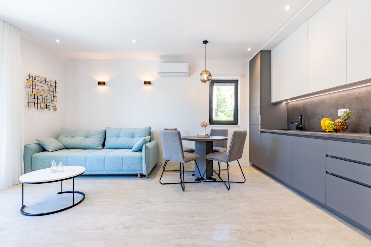 New building (2020), with private key card entrance, private parking garage for 2 cars. City center,50m from marina and sea, 5 minute walk to Kolovare beach, 7 minutes walk to old town. Designer decorated, with fiber optic star sky, interior led lighting and light ambience system. All rooms are equipped with automatic air-condition.