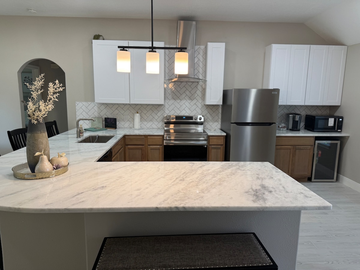 Genieße unsere Suite im zweiten Stock. Familienfreundliches tolles Zimmer & Spielbereich mit Tischtennis/Pooltisch, praktisches ausziehbares Queensize-Schlafsofa & Küchenzeile. Sauberes 3/4-Badezimmer mit Duschkabine. Ruhiges Schlafzimmer mit Kingsize-Bett und Etagenbett. Separater Eingang durch Garage bietet Privatsphäre. Es gibt keine Gemeinschaftsräume, aber die Gästesuite ist mit unserem Haus verbunden.