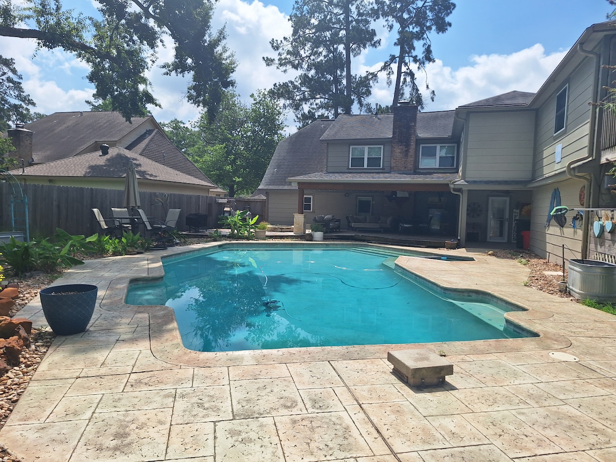 Willkommen in unserem neu renovierten modernen Bauernhaus. Genieße deinen Urlaub mit Familie/Freunden in unserem warmen und gemütlichen Zuhause, ergänzt durch einen privaten Pool und ein Spa. Die Unterkunft verfügt über viele Zimmer und Aktivitäten für alle. Jedes Zimmer des Hauses verfügt über große Fenster, die natürliches Licht durch das ganze Haus lassen. Die Unterkunft liegt in Spring Texas, nur wenige Minuten von The Woodlands, Conroe und Houston entfernt. Komm und erlebe das Gefühl „Zuhause in der Ferne“ in unserem Haus.