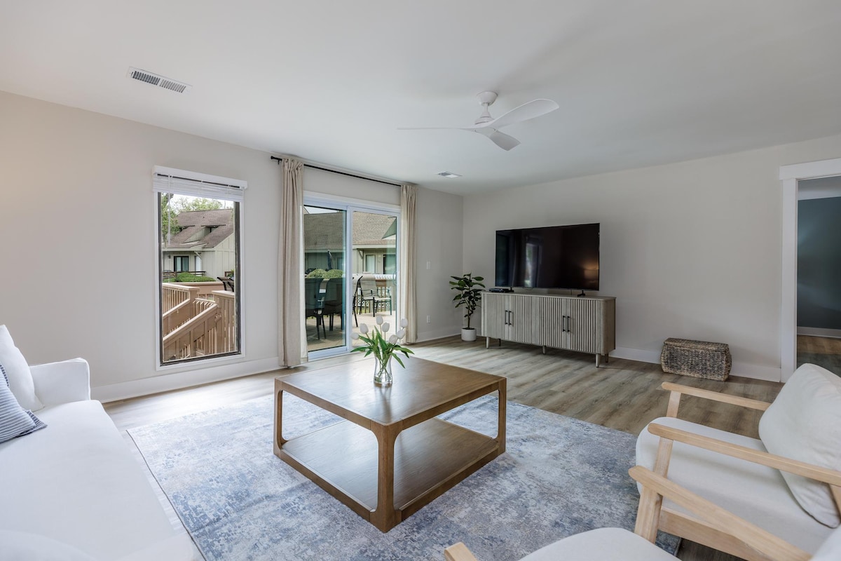 Unsere neu renovierte 2 BR/2 BA Fiddler's Cove Villa kann gemietet werden! Das 24E befindet sich auf der ruhigen dritten Etage und ist geräumig und modern. Die Küche verfügt über neue Schränke, Quarz-Arbeitsplatten, GE-Geräte und schwimmende Regale. Hinter Scheunentüren befinden sich die Waschmaschine, der Trockner und die Speisekammer. Aktualisierte Badezimmer verfügen über neue Waschtische und Fliesen. Der Essbereich verfügt über eine Kaffee-/Weinbar und Sitzplätze für sechs Personen. Der Wohnbereich verfügt über ein Queensize-Schlafsofa, Seitenstühle und einen 65-Zoll-Fernseher.