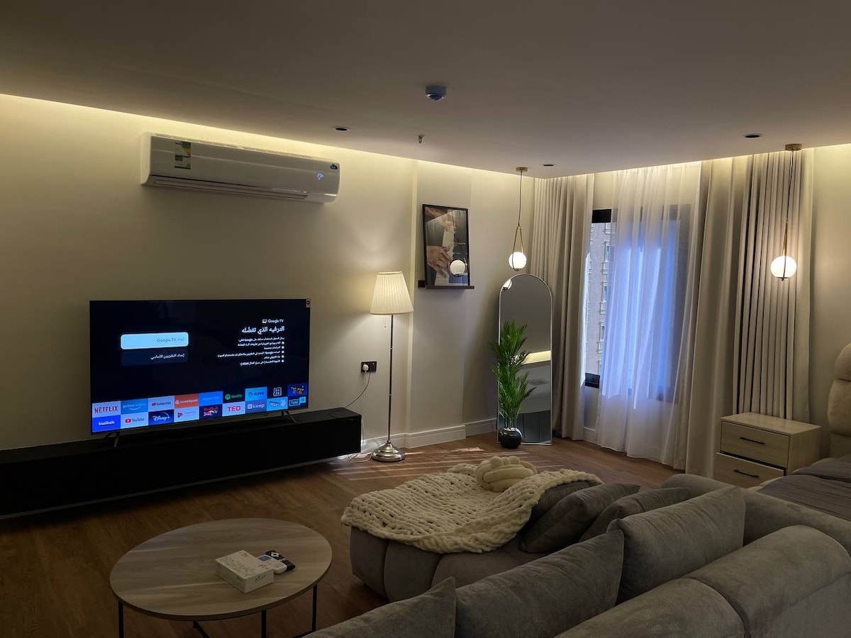 Die Wohnung liegt im Westen von Dammam, Al Faisaliah in der Nähe aller Dienstleistungen wie Restaurants, Cafés und Komplexe wie die Nakheel Mall und zeichnet sich durch ruhige und komfortable Farben und die meisten täglichen Bedürfnisse wie Kühlschrank, Mikrowelle, Wasserkocher, Backofen und Smart-TV aus. Es verfügt über eine Wäscherei, ein Café, einen Shahi-Shop und ein Frühstück mit der gleichen Architektur daneben.