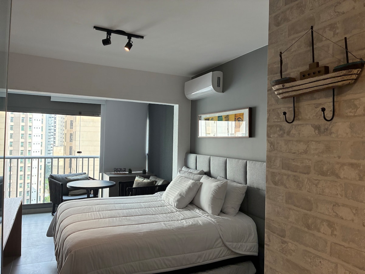 Tolle Wohnung im 22. Stock für diejenigen, die eine ausgezeichnete Lage in SP suchen. Ob für Arbeit, Freizeit oder mit Kindern, der gemütliche und gut gelegene Ort in São Paulo mit Blick auf die Av. Ibirapuera wird Ihre Reise zu einem unglaublichen Erlebnis machen. 1 Wohnzimmer 1 Schlafzimmer mit allem inklusive - Klimaanlage - 600M WLAN und Kabelfernsehen - Parkplatz inklusive - Gemeinschaftswäscherei - Bettwäsche und Handtücher - Voll ausgestattete Küche - Verdunkelung im Schlafzimmer Fragen Sie nach flexiblem Check-in und Check-out.