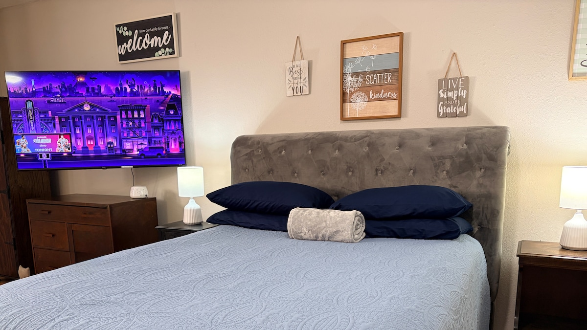 Check-in starting 4p Early check-in options: 3p $10 2p $15 1p $20 12p $25 Check-out by 11a Late check-out options: 12p $10 1p $15 2p $20 3p $25 Please set your guest count for correct pricing. PRIVATE ENTRY Pictures 2-9 - bedroom w/ Cali King sized bed, 65” smart TV, bathroom w/ 2 vanities, soaking tub w/ jacuzzi jets, walk-in shower, large walk-in closet (doubles as small room w/ twin bed - ask), are all privately your area. Other pics show common area