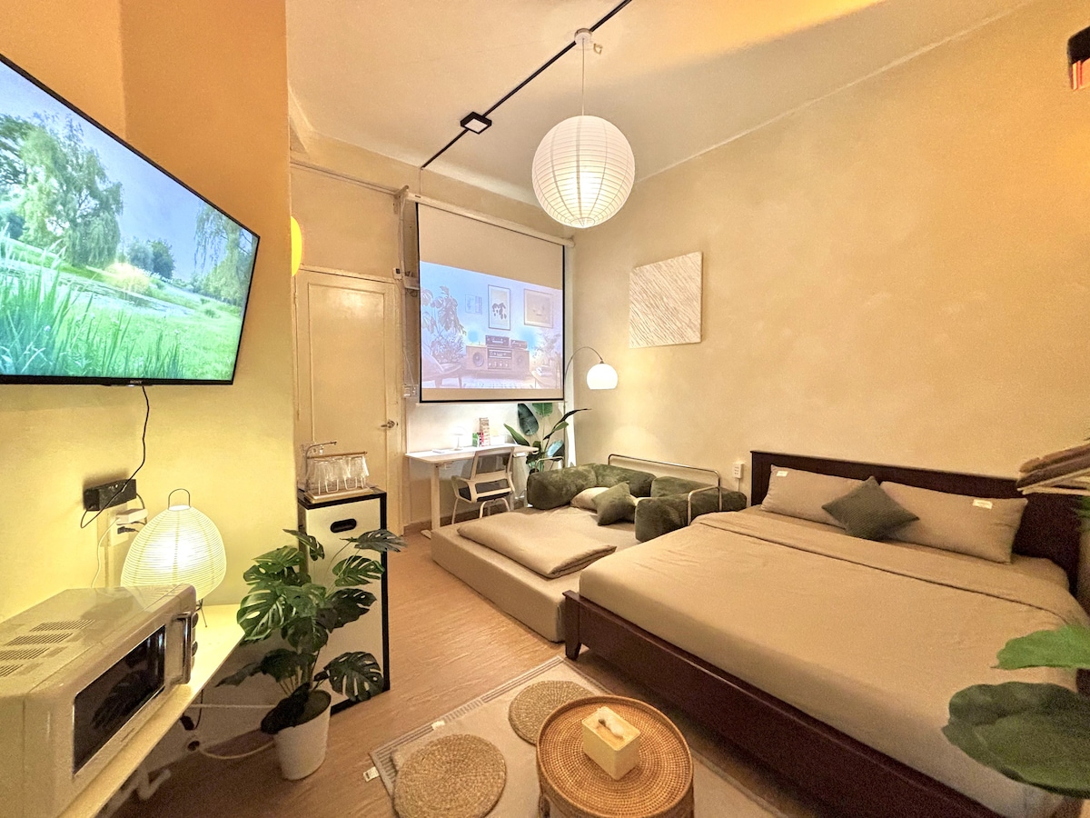 Komorebi @ Cozinema bietet drei unschlagbare Funktionen: 1. Top-Lage: Herz von HCMC, 1 Minute zur Bui Vien Street und 5 Minuten zum Ben Thanh Market. Umgeben von Cafés, lokalen Restaurants und öffentlichen Verkehrsmitteln direkt vor der Haustüre. 2. Skyline- und Parkfrontblick: Genieße einen luftigen Balkon mit Blick auf den 23/9 Park, der üppiges Grün mit atemberaubenden Skyline-Lichtern der Stadt bei Nacht verbindet - die perfekte Balance aus Ruhe und Lebendigkeit. 3. Filmischer Rückzugsort: 100" 4K-Projektor & Dolby 5.1 Audio für ultimative Entspannung.