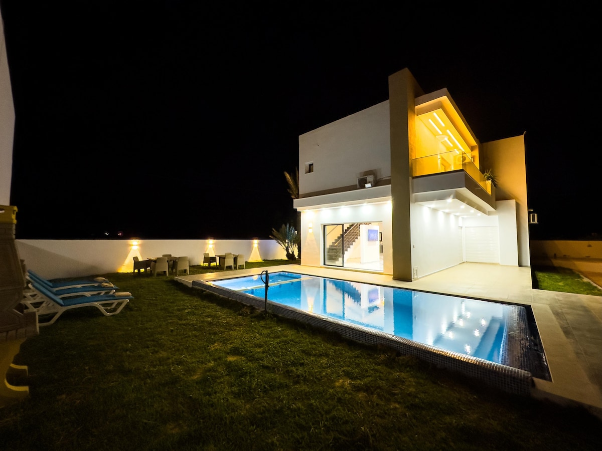 .Ce logement paisible offre un séjour détente pour toute la famille. villa de haut standing vue mer avec piscine priveé ❤️ 📍 en face hôtel Radisson Bleu Djerba se compose de: ✅ Piscine privée . ✅ 1 Suites parentale et 2 chambres à coucher , les chambres sont climatisé ✅ 3 salles de bain 🛁 ✅ un grand jardin , barbecue et un garage privé ✅ une cuisine moderne aménagée par des espaces de rangement et bien équipée . ✅ 1 salon et salle à manger ✅ Accès internet gratuit