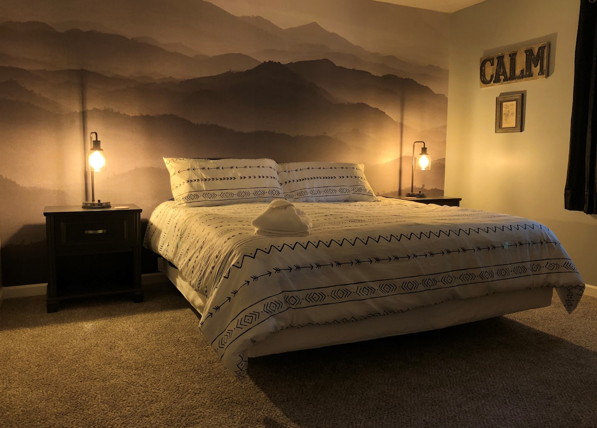 Trippy psychedelia honoring our local and global icon, Dolly! We offer a unique space with comfortable accommodation while having access to attractions in Gatlinburg and Pigeon Forge. Dolly grew up around these parts and you can also fame it up while on vacation! Perfect for 4 people traveling together with the ability to WFH on exclusive, unshared Comcast Xfinity wifi internet. We have several units available on this street all sleeping up to 4 people. Click our profile to see the rest!