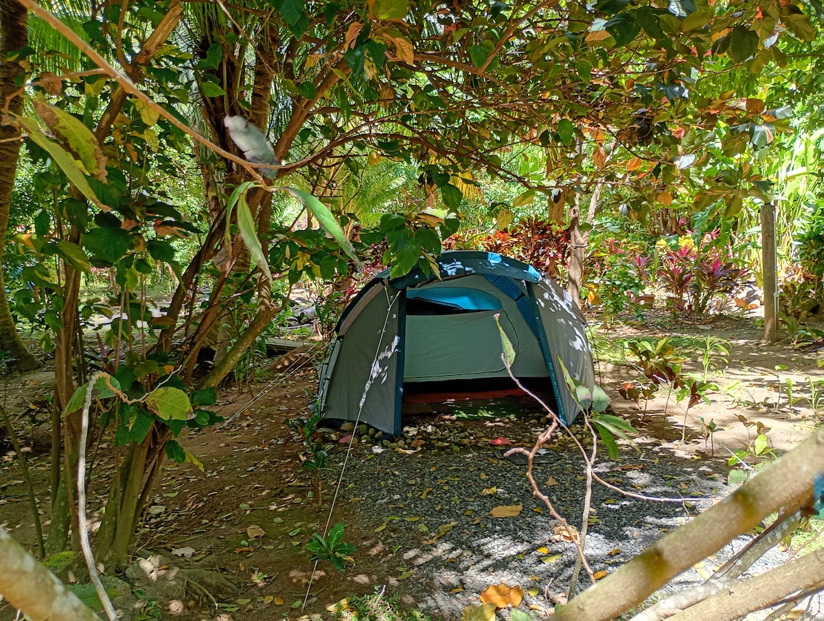 Zwei Zelte warten auf Sie: eine zum Schlafen mit einer echten Queensize-Matratze, ein weiteres mit einem Wohnzimmer und Stauraum. Und dazwischen Ihr privater Essbereich. Eingebettet unter den Kakaobäumen, nur 20 m vom Pool entfernt für erfrischende Sprünge. Außendusche und Küche am Pool mit Grill inklusive! Es gibt einen Batterieventilator, einen Solargenerator zum Anschließen Ihrer Geräte, Solarlampen und WLAN. Es ist Camping mit allem Komfort!