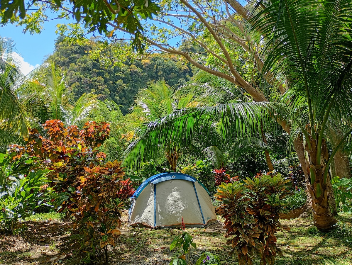Waitikubuli National Trail Wanderer und Naturliebhaber, Zelt (bringe dein eigenes mit oder miete eines von uns) hinter der Hauptküche (siehe Bilder). Du hast Zugang zum Gelände, einschließlich der Küche und des Waschraums (einschließlich neu gebauter Dusche), des Grills und des Terrassenbereichs. Kostenloses Frühstück ist inbegriffen (siehe Hinweise unten). Zusätzliche lokale Mahlzeiten können mit 24 Stunden im Voraus gekauft werden. Komm und genieße einen erholsamen Aufenthalt auf dem Land Kalinago mit herrlichem Blick auf das Meer und die Inselchen, bis bald!