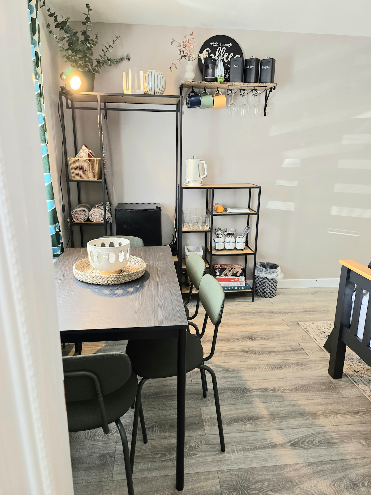 Private Wohnung im Obergeschoss mit separatem Eingang. Keine Küchenausstattung außer Wasserkocher, Mikrowelle und Kühlschrank. Grill auf Anfrage verfügbar. Zwei Schlafzimmer sowie ein Spielzimmer mit Snookertisch und Billardtisch und Dartscheibe und Matte sowie ein Fitnessraum. Inklusive privater Sitzecke mit TV und Radio. Privates Badezimmer mit einer Dusche. Kontinentales Frühstück mit kostenfreiem WLAN. Reisebett verfügbar und Klappbett. Bettenbahn auch für Kinder verfügbar. Ein elektrisches Autoladegerät ist ebenfalls vorhanden.