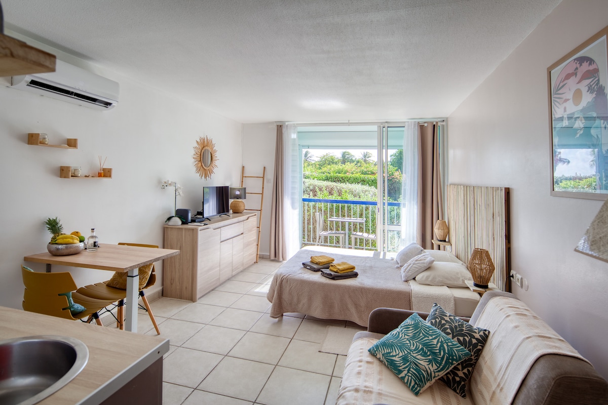 Großes, erfrischtes Studio von ca. 35 m2, mit Meerblick, in einem wunderschönen Feriendorf In diesem 3-Sterne-Komplex haben Sie 2 Pools, einen Minimarkt, einen Waschsalon, einen Wellnessbereich, einen Zugang zu 2 kleinen Stränden und 2 Restaurants mit Blick auf das Meer. Die Residenz befindet sich in Grande Terre, ideal gelegen, 10 Autominuten von Sainte Anne und 15 Minuten von Saint François entfernt. Nahversorger liegt nur in nur 10 Fahrminuten