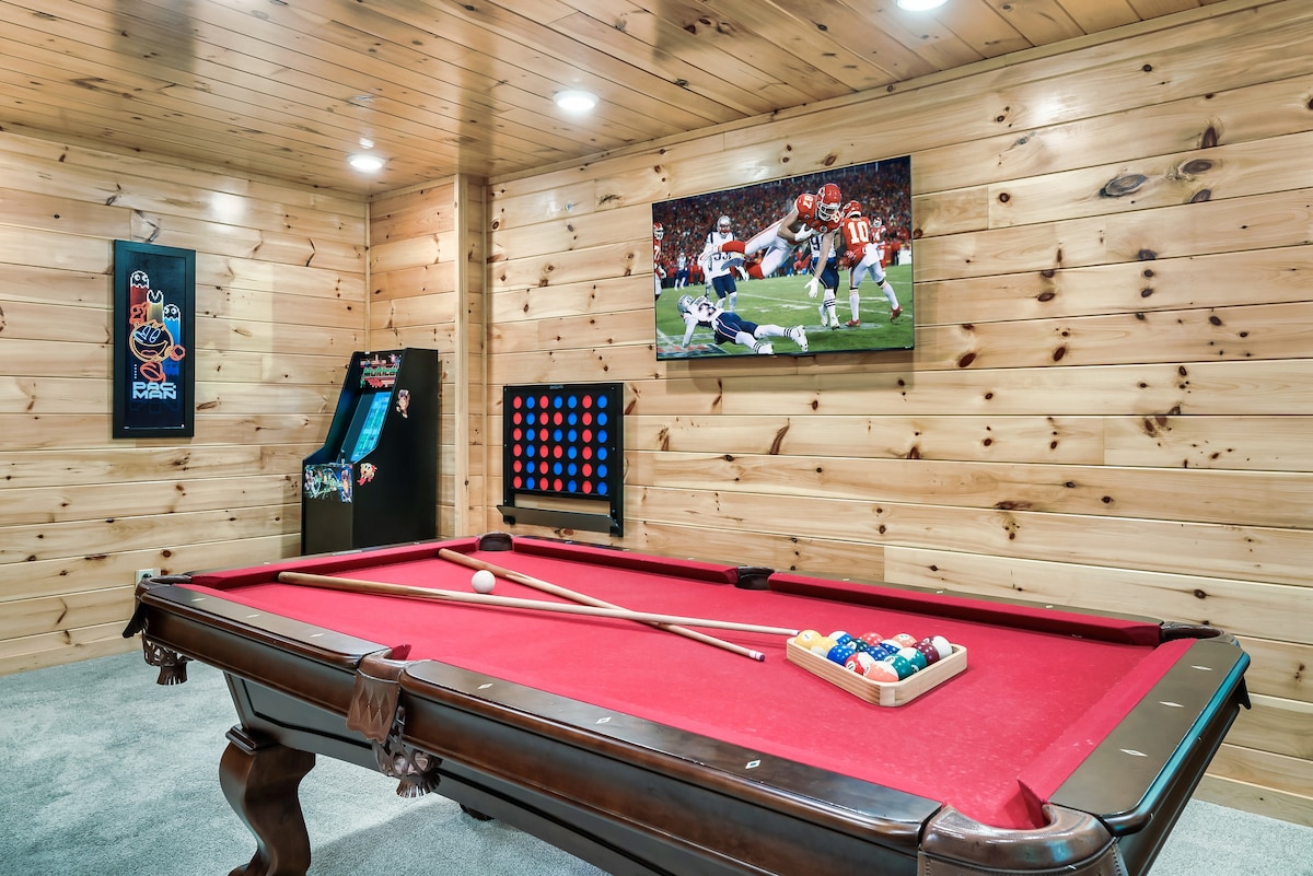 Genieße das Planschen in deinem eigenen privaten ganzjährigen Innenpool, entspanne dich im Whirlpool auf der Terrasse und genieße den herrlichen Herbstblick von jeder Ebene! Verbringe Zeit miteinander, um Pool, Arcade-Spiele zu spielen und Filme auf dem 65-Zoll-Fernseher anzusehen. Groß genug, um bequem 8 Personen unterzubringen, aber großartig genug für einen Kurzurlaub mit Paaren. Eine 3.000 Quadratfuß große Luxuskabine mit 2 Kingsize-Schlafzimmern und Etagenbett für die Kinder. Eine der besten Pool-Hütten, um den Herbst und die Feiertage in den Smokies zu erleben!