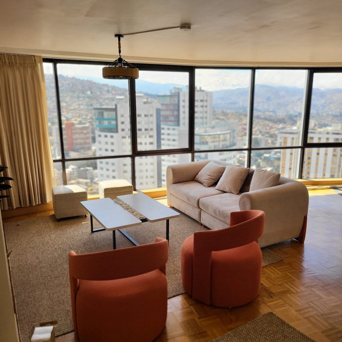 Exklusiver Penthause mit unvergleichlichem Panoramablick auf die „Illimani“ und die Stadt. - Im Herzen von Sopocachi gelegen, in der Nähe von Supermärkten, Restaurants und öffentlichen Verkehrsmitteln -WLAN 5G - Separate Küche, Nexflix, Waschmaschine und Warmwasser - Sicherer und privater Zugang mit Panoramaaufzügen und 24/7-Sicherheitsdienst 1. Hauptschlafzimmer mit Queensize-Bett für 1 oder 2 Personen 38 Dollar (das zweite bleibt geschlossen) 2. Zweites Schlafzimmer (optional) Doppelbett für 8 $ pro Person verfügbar.