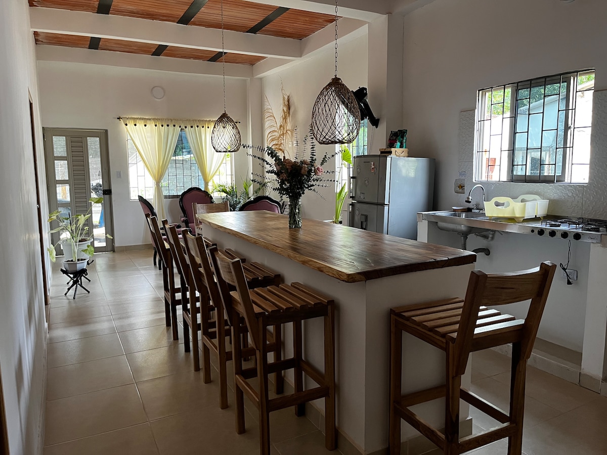 Dieses rustikale Haus mit Blick auf die Karibik ist ideal für Familien oder eine Gruppe von Freunden. Nur 7 Minuten vom Hauptplatz von Tolú und 5 Minuten vom Playa El Francés entfernt. Zu den Räumen gehören: – Ein Pool im Tankstil mit Blick auf das Meer – Essbereich im Freien, Strandstühle, Hängematten und ein großer Kiosk – 7 Schlafzimmer mit Ventilatoren und Klimaanlage – Voll ausgestattete Küche – Kapazität für bis zu 16 Gäste – Kostenloses WLAN und grundlegender Reinigungsservice inklusive (deckt nicht das Kochen oder die Wäsche ab) – Hausmeister vor Ort rund um die Uhr