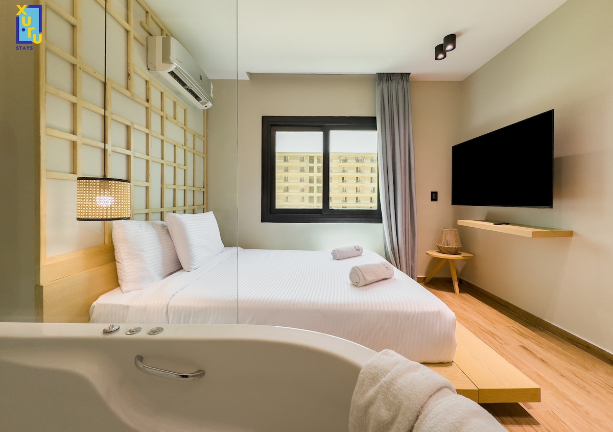 Du wirst dieses trendige Studio, das bequem für 3 Gäste geeignet ist, nicht so schnell vergessen. Verfügt über 1 Schlafzimmer mit Kingsize-Bett, luxuriösem Whirlpool und kabellosem Massagegerät, während du einen 55-Zoll-Samsung-Smart-TV für ein außergewöhnliches Erlebnis auf einmal ansiehst. Perfekt für Paare, Solo- und Geschäftsreisende. Verfügt auch über ein komplettes Badezimmer, eine offene Küchenzeile, die komplett ausgestattet ist Beginne deinen Morgen mit einer reichhaltigen Tasse Nespresso-Maschine mit 2 kostenlosen Kapseln. Bitte beachte, dass arabische und ägyptische Staatsbürger:innen vor dem Check-in einen Nachweis über die Ehe vorlegen müssen.