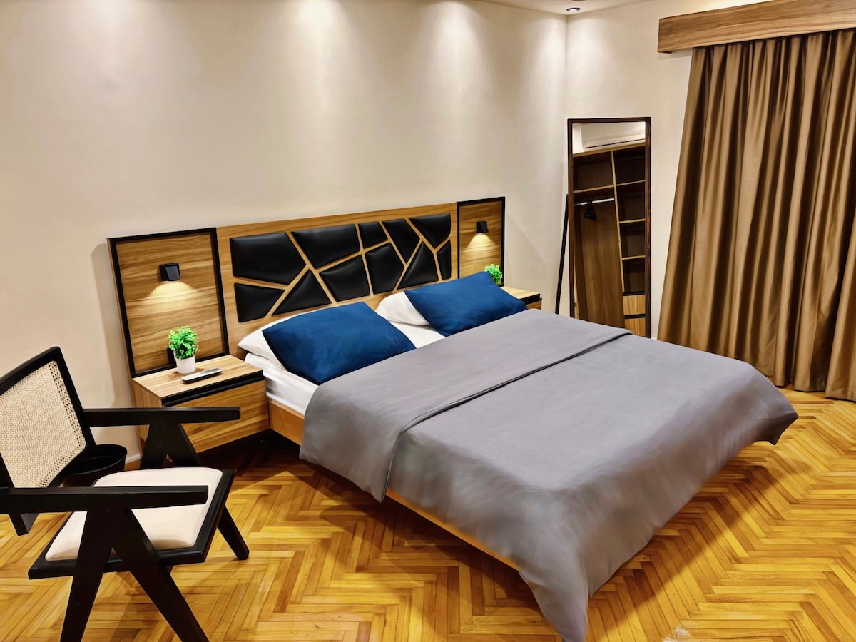 Willkommen in deinem Zuhause, geeignet für kurze und lange Aufenthalte. Unsere geräumige Wohnung mit 2 Schlafzimmern ist nur 5 Minuten vom Flughafen Kairo entfernt. Das Hauptschlafzimmer verfügt über ein Kingsize-Bett und ein Babybett für deine Kleinen (0-8 Jahre alt). Das zweite Schlafzimmer verfügt über zwei mittlere Betten. 50-Zoll-Fernseher (Netflix inklusive) hat alles, was du brauchst, vom Gasherd bis hin zu einer Mikrowelle und einem Wasserkocher. Entspanne dich auf dem Balkon mit herrlichem Blick auf den Baum oder spaziere nur eine Minute zu lokalen Supermärkten, Bäckereien und vielem mehr.
