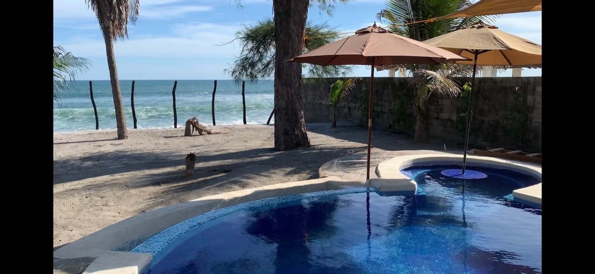 Vordere Strandhaus, umweltfreundlich mit 90 Fuß langem Pool, 4 Schlafzimmern, privater Hängematte im zweiten Stock, Wohnraum und Meerblick, Queensize-Betten, alle mit Klimaanlage. 1 Standard-Schlafzimmer in voller Größe, alle mit eigenem Bad. voll ausgestattete Küche, Social Palapa mit Lufthängematte bis zu 6 Personen, Wohnstraße, Grill, Terrassen am Meer. TV-Wanderung, soziales Badezimmer, Starlink-WLAN, 2 Stunden vom Flughafen entfernt. Parkplatz bis zu 8 Autos.
