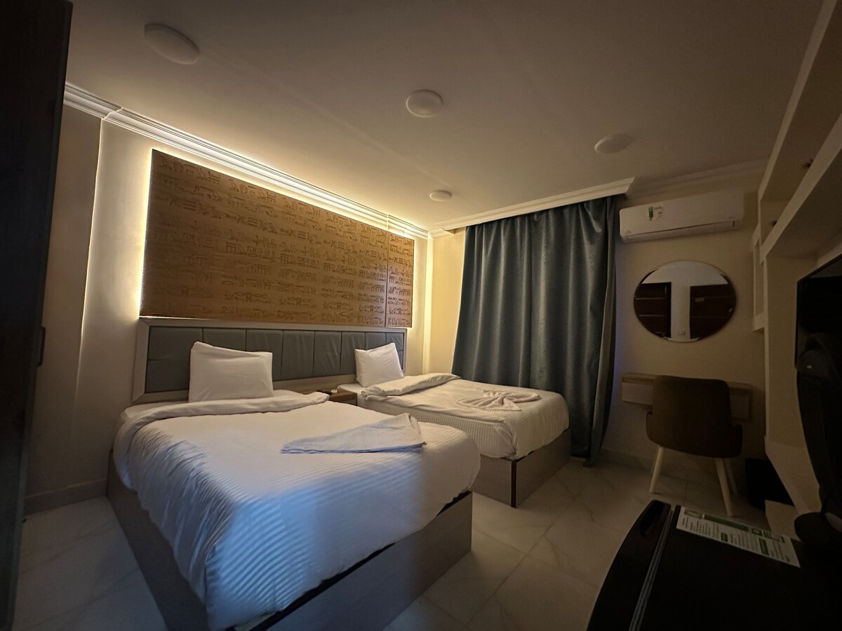 Wache in diesem gemütlichen, sonnendurchfluteten Zweibettzimmer mit atemberaubendem Blick auf das Große Ägyptische Museum auf. Genieße ein köstliches traditionelles ägyptisches Frühstück, das jeden Morgen auf dein Zimmer serviert wird. Mit modernen Annehmlichkeiten, bequemen Betten und einer ruhigen Atmosphäre ist es der perfekte Ausgangspunkt, um Kairo und die Pyramiden von Gizeh zu erkunden. Schnelles WLAN, Klimaanlage und tolle lokale Restaurants in der Nähe. Ein einzigartiger Aufenthalt mit einer Aussicht, die du nicht vergessen wirst – buche jetzt und erlebe Ägypten von deinem Fenster aus!