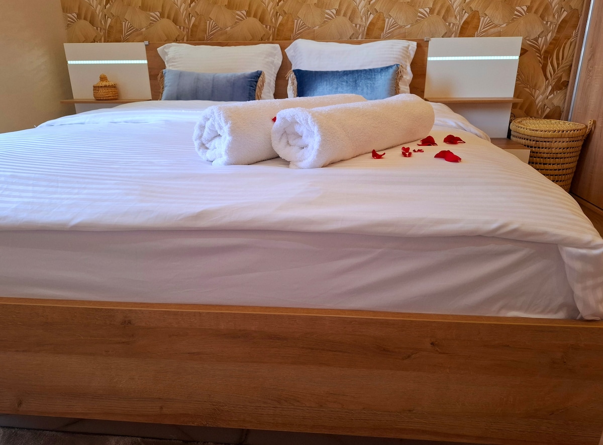 Luxuriöses Zimmer : Queensize-Bett ,kleine Terrasse mit Blick auf das Meer,ein kleiner Salon,moderne Toilette, eine gut ausgestattete Dusche mit Handtüchern,natürlicher Seife und Shampoo.