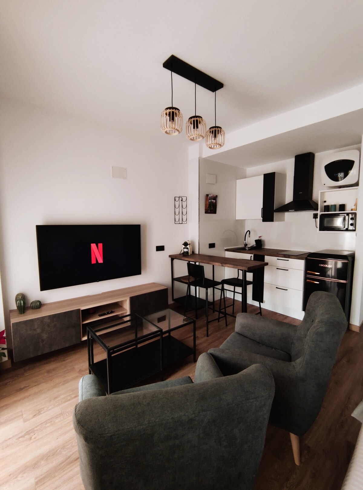 Komfortable 55m Wohnung im Zentrum von Jerez. Sehr hell, nach außen gerichtet und neu renoviert. Ein geräumiges Zimmer mit Doppelbett 160 x 200 mit Schrank und Stauraum für Koffer + Ganzkörperspiegel. Ein voll ausgestattetes Badezimmer, sogar mit Haartrockner und Duschgel... und die Küche ist komplett ausgestattet. Das Wohnzimmer verfügt über ein Doppelschlafsofa und einen bequemen Sessel und Tisch und Esszimmerstühle. Wir haben Internet und 40" LED-Fernseher und... alles ist neu!