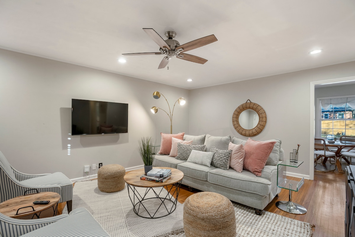 Übernachte stilvoll in diesem neu renovierten Haus (Aug. 2025) in der Nähe von Expo Square, TU, Cherry Street, Utica Square und Downtown Tulsa. ✰ Privater umzäunter Hinterhof mit Grill und Sitzgelegenheiten auf der Terrasse ✰ Weiche Memory-Schaum-Betten in jedem Zimmer, Kingsize-Bett im Hauptschlafzimmer ✰ 1000 Mbit/s WLAN + 4 Roku-Fernseher zum Streamen ✰ Voll ausgestattete Küche ✰ Waschmaschine/Trockner, Pack-N-Play, Hochstuhl ✰ Einfacher eigenständiger Check-in ✰ Gemütlicher Elektrokamin ✰ Hunde willkommen (max. 3, unter 36 kg, 100 $ Gebühr) Geh einfach zur TU und erreiche den EXPO-Platz in weniger als 3 Meilen.